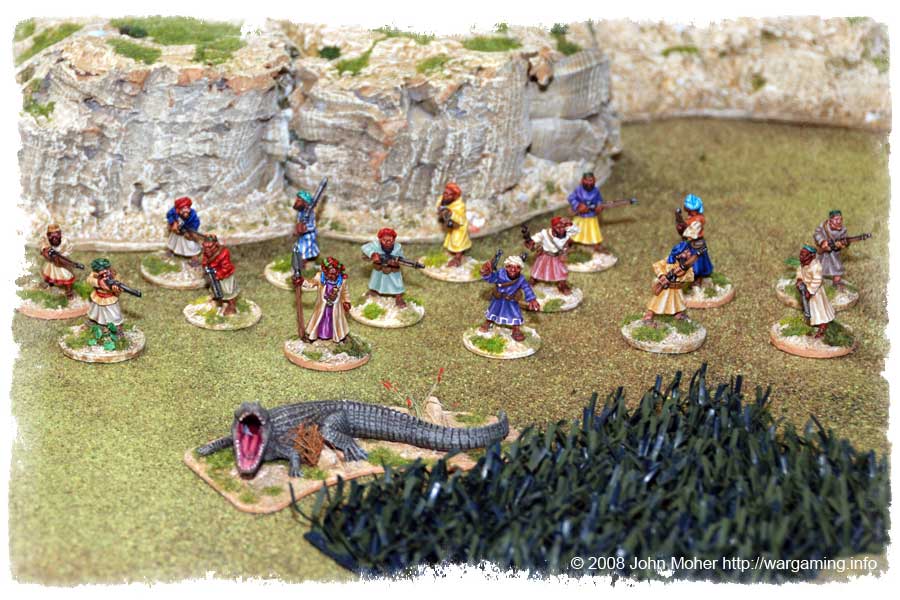 It also seems the dastardly Zanzibari know no end! Not only have they regroup in significant numbers and managed to keep the tribes stirred up, but they have also brought along a (albeit antique) cannon! Soon there are restless natives swarming from everywhere, even the supposedly friendly nearby village – where do they all come from Kofler muses? Even the Crocodiles are restless! Soon they German camp, with its improvised barricades, is yet again under heavy attack…
