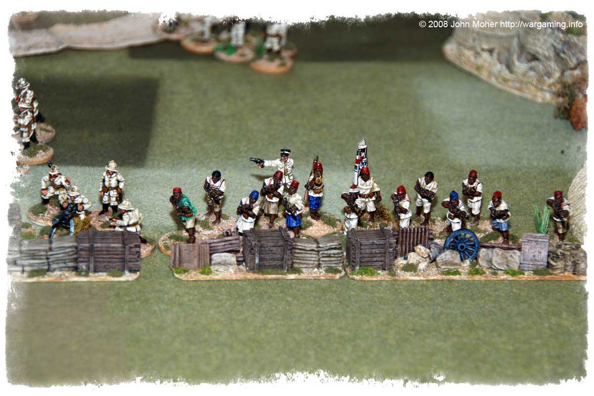 Meanwhile the Seebatallion scouts have moved out and combined with the unit’s firing, scared off the small group of Zanzibari, however as they approach the forest to ensure it is clear they get surprised by a large body of particularly blood thirsty looking tribesmen; Heilige Scheiße! As they flee back to the main seebatallion body, Kofler is faced with an increasing and rapidly approaching mass of tribesmen on the left, his askari firing repeated volleys into them but failing to stop the charge. Soon they are almost on top of the improvised barricade. A brutal melee ensues while at the same time more tribesmen come close to assaulting the seebatallion, however these are decimated by the latter’s disciplined fire, and that group breaks and runs after having suffered horrendous casualties…