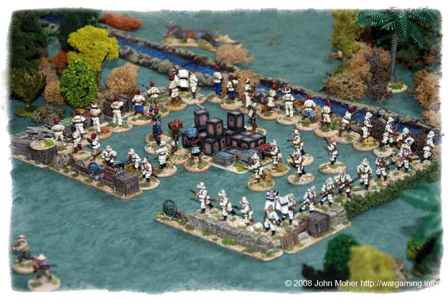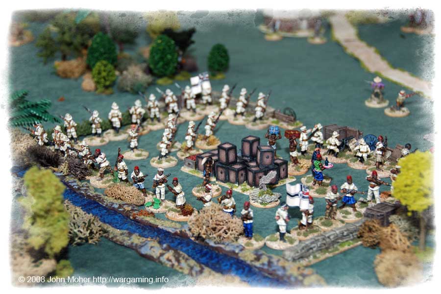 A large group of fresh tribesmen, the last to arrive, then make a run for the entrance, planning to overrun the Maxim, and flood through the vulnerable point in the defence, Feldwebel Orange-Haare rushes the Brandbekämpfung Brigade to the MG detachment’s support, meeting the tribesmen head on in the entrance! Somehow the main body of the Seebatallion Company have thrown back another group of tribesmen, but taken significant casualties in the process! However the remaining groups get inside the perimeter, and despite the third group being almost annihilated to a man, one daring warrior manages to get well inside and singlehandedly down several of the Marines, including the Company Bugler, and is only finally stopped by the intervention of Hauptmann Muenst who personally dispatches him in individual combat as he’s finishing off another Marine! However Muenst now only has himself and a couple of other men still combat effective from his original 15! Meanwhile Kofler’s Askari are still trying to deal with the Zanzibari and the less well armed Native Riflemen along their perimeter, as the wounded Kofler lies vulnerable amongst them!