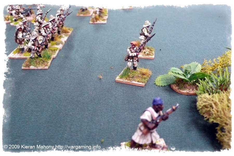 Back on the other flank the Marines opened up on the Azande riflemen who had gunned down the Askari scouts and the native riflemen were taking heavy losses – they couldn’t match the Seebatallion firepower. The Askari unit was unable to help, as its view of the fire fight was obscured by the thick jungle. However another group of tribesmen soon appeared, trying to sneak up on the Imperial Kaiser’s forces without being exposed to the Seebatallion Maxim Machine Gun or deadly Riflemen. The Marines then staunchly charged the Zanzibari gun, hoping to overrun it, however the Zanzibari simply fled – abandoning it to the Marines (who later discovered it had no ammunition remaining anyway).