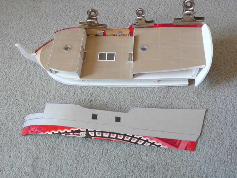 For this side I found it much easier to glue all 3 layers together and then glue it onto the ship. The cardboard is pretty thin so I curved it to fit the side of the boat before the glue dried completely.