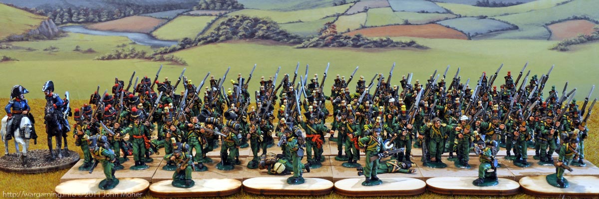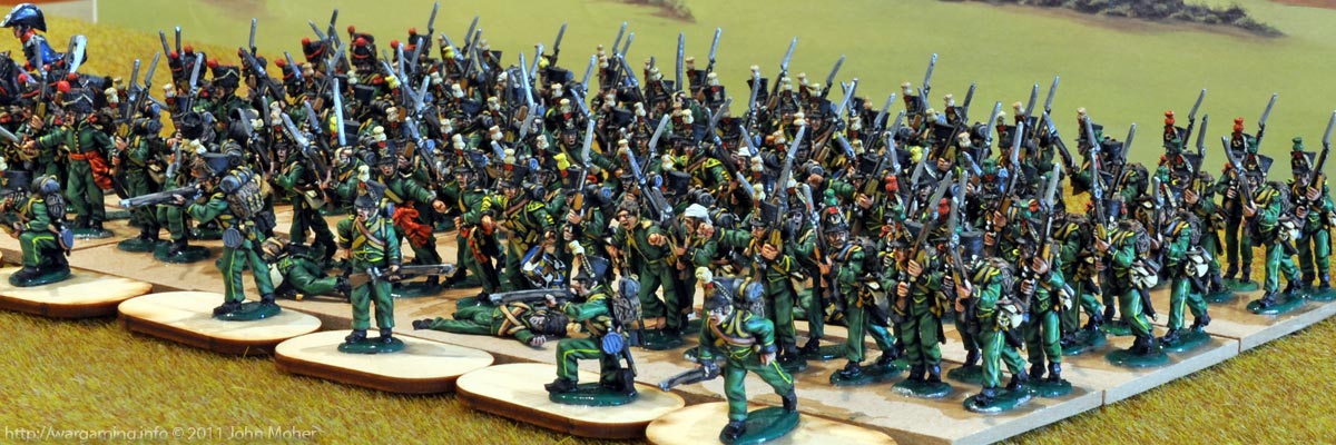 A few of the Light (Voltigeur) Company chaps need their shako plumes corrected – I actually made the decision a long time ago that for my 1815 Hundred Days Napoleonics I was going to commission the painting,  as I wanted to maximise the the detail and appearance of the uniforms, but not wait 500 years to finish them (which is what would happen if I was painting them myself) – and a few of the flank company chaps have slipped through quality control checks with the wrong colour plumes! The big hold-up with these is I originally put the units together in 2008 for the SHAKO II rules, but we were using ‘economical’ units of 16-figs (on 4 bases) at that time, and as under Lasalle these are “large” units (6-bases) they needed about 39 figures per battalion (once you included skirmisher markers and a casualty figure) – the real life battalions were each around 900 men strong at the outset of the campaign – so I went from having about 54 figs to needing 117! So that was an extra 63 figures to buy and get painted!