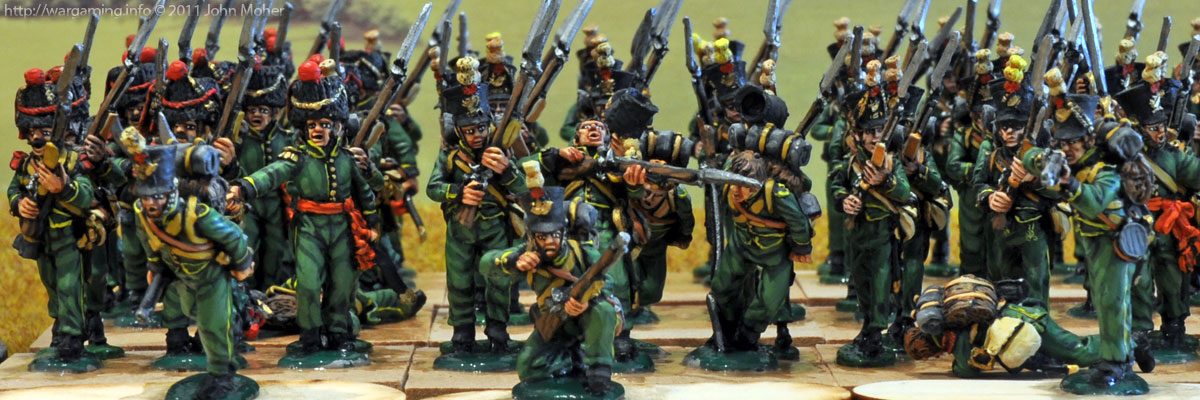 Addendum: I should point out the skirmishers in the front rank are actually the Nassau Volunteer Jäger Company figures from Perry Miniatures painted up as the 2nd Nassau-Usingen Regiment. Although they were volunteers from the same area as the 28th Oranien-Nassau Regiment (and were attached to that Regiment) their uniform very closely resembled the 2nd Nassau-Usingen’s Voltigeurs so I have used them here as surrogate skirmishing Nassau-Usingen Voltigeurs (although the shako plumes are the wrong colour and need repainting green).
