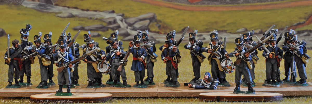 7th (Belgian) Line Battalion (Regiment) – this was the only regular line battalion (and one of only two regular battalions) in the brigade, and numbered around 700 men – in Lasalle terms it’s at the upper end of the standard sized unit (4-bases) but not quite large enough to warrant being classed as large (6-bases). I have done 2 Skirmisher Stands for this unit as it’s debatable whether it warrants 1 or 2 so I have erred on the safe side (i.e. whether it’s skirmishing ability was as good as the French & British battalions which get 2 skirmishers, or should be less so only 1). Like all my Quatre Bras Dutch-Belgian-Nassau-Brunswick forces these chaps are all Perry Miniatures and were commission painted by Dragon Painting Services in Hong Kong, and I originally had units of 16 figures for Shako II, but had to enlarge the units from 16 to 24 or 36 plus skirmisher & casualty markers.