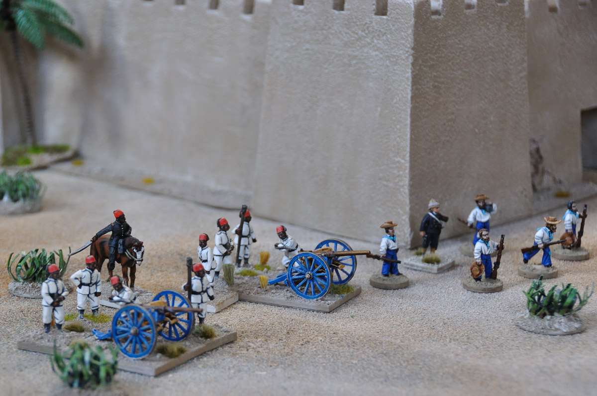 Sayed Bey elects to commit his entire garrison to the venture, and Talahawiyeh‘s detachment of armed sailors are also disembarked to participate in the action, Talahawiyeh herself will then provide flanking fire support from the Nile – as the main attack will be conducted close to the river bank to maximise this support. Sayed Bey deploys his two infantry companies on his left adjacent to the Nile, while on his right he deploys his full artillery battery supported by Talahawiyeh‘s provisional marines (i.e. armed sailors). The full Anglo-Egyptian force was thus: