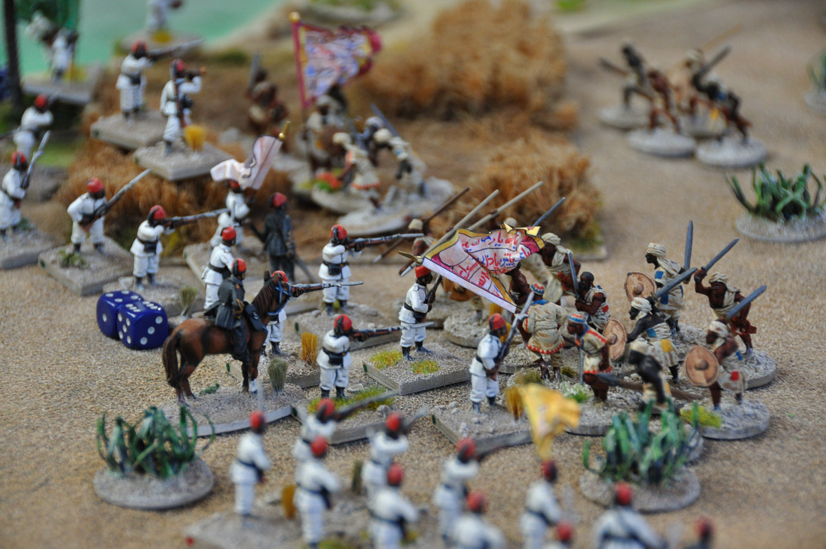 On the left the 4/5th Rifles are caught in open order by the first wave of Dervishes, and a furious mêlée ensues, with casualties to both sides before the Ansars are thrown back, and only after the loss of the Egyptian Company Commander; Captain Wahab El Zahra Agha. On the right the Red Flag Riflemen have been despatched by the Anglo-Egyptian Artillery & Sailors, but more riflemen (from the Green Flags) are now approaching. In the centre the main body of the Green Flags Rub, including a band of fanatical Beja Hadendowa Fuzzy-Wuzzy Warriors, is now bearing down on the Egyptian 3/1st Rifle Company.