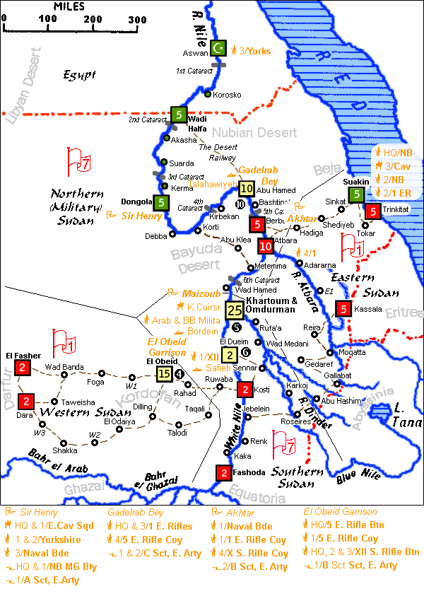 In Khartoum Maizoub Bey prepares to send the valiant Bordein forth again while further South Safieh also prepares to set forth, and in El Obeid the acting garrison commander Mulazim Jassim Musalem Effendi (5th Egyptian Rifle Battalion) prepares to dispatch the XIIth Sudanese Battalion (of 2 Companies) in a breakout and march East to Kosti on the Nile. This is the situation in the first days of March as the Revolt in the Sudan continues to unfold…