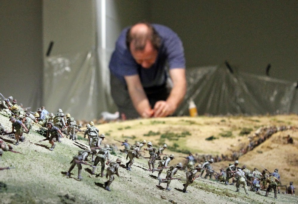 Over the past months over 100 New Zealand wargamers have been painting 5,000 miniature soldiers for a huge diorama of the Battle of Chunuk Bair for the forthcoming The Great War Exhibition in Wellington. This is part of an ANZAC commemorative project put together by Sir Peter Jackson who has over the past years commissioned the Perry Brothers to sculpt and cast the 54mm scale figures for this. In 2015 a large posse of New Zealand Wargamers were then recruited to paint this huge mountain of lead in time for the ANZAC Day 2015 (25 April) commemorations.