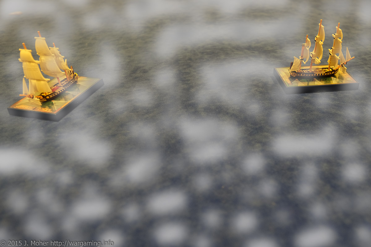 HMS Sybille (for this is Capitaine Géroux’s prey) is to the stern of Dryade, and just as she had thought she might slip away in the fog is actually about to be taken aback caught by the rising wind as the fog clears. A sister ship to Dryade (originally of La Royale – The French Royal Navy) HMS Sybille is a 34-gun Frigate and her captain, Commander Crofton Merrick Seward-Beckham, is now forced to rapidly clear for action as the Dryade materialises out of the fog slightly astern to larboard! As both vessels frantically clear for action, the fog clears and the two captains issue their orders – Capitaine Géroux orders Dryade to come about hard to larboard in an aggressive turn that will sacrifice trying to gain the weather gauge but hopefully bring her rapidly into close action with HMS Sybille. Onboard the latter Commander Seward-Beckham is instead contending with the wind as his charge is rapidly taken aback, the wind that has cleared the fog and exposed her has also caught her on a bad heading, she is twice cursed!