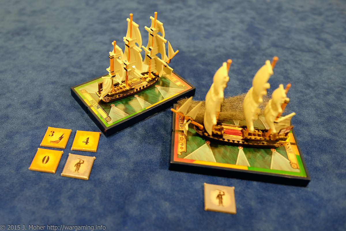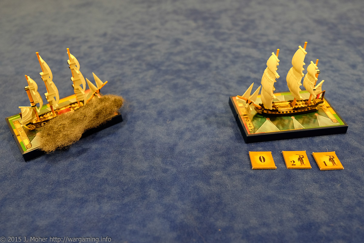 Dryade is taking a pounding – she’s had nearly 30% Hull Damage and her crew have near 45% hors de combat! As the two vessels manoeuvre around each other from the collision Sybille maintains her dominant position as Capitaine Géroux tries vainly to pull Dryade clear of her adversary and hopefully temporarily out of arc of her deadly guns! This fails miserably and exposes Dryade to a potential stern rake – but luckily Seward-Beckham’s larboard broadside is still reloading and can’t make use of the opportunity!